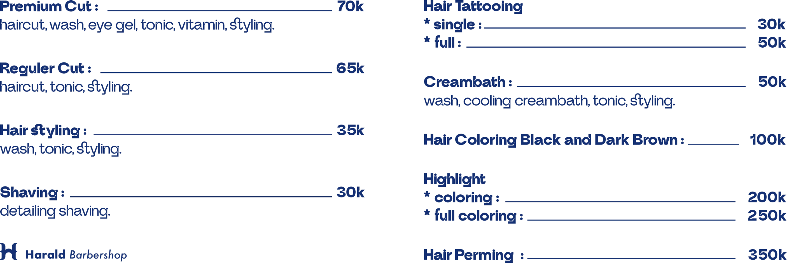 Harlad Barbershop adalah tempat di mana Anda dapat menemukan keahlian dan layanan terbaik untuk perawatan rambut Anda. Kami menghadirkan suasana yang nyaman dan ramah, sehingga Anda dapat merasa santai dan percaya diri saat mempercayakan penampilan Anda kepada kami.